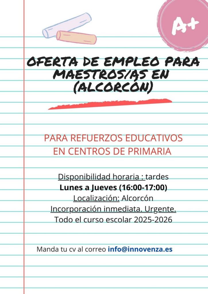 PARA REFUERZOS EDUCATIVOS EN CENTROS DE PRIMARIADisponibilidad horaria: tardes Lunes a Jueves (16:00-17:00) Localización: Alcorcón….